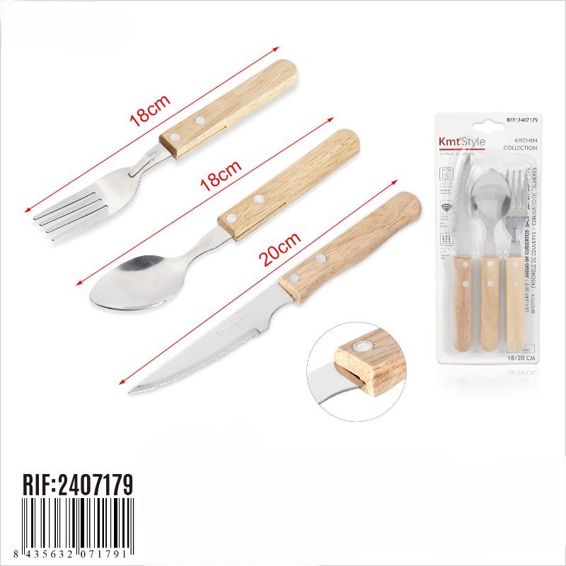 Conjunto de talheres com 3 peças, composto por faca, garfo e colher, fabricados em aço inoxidável (inox) de alta qualidade, que garante elevada durabilidade, resistência à corrosão e desempenho prolongado. As pegas são produzidas em madeira tratada, oferecendo ergonomia, conforto no manuseio e um acabamento estético distinto.