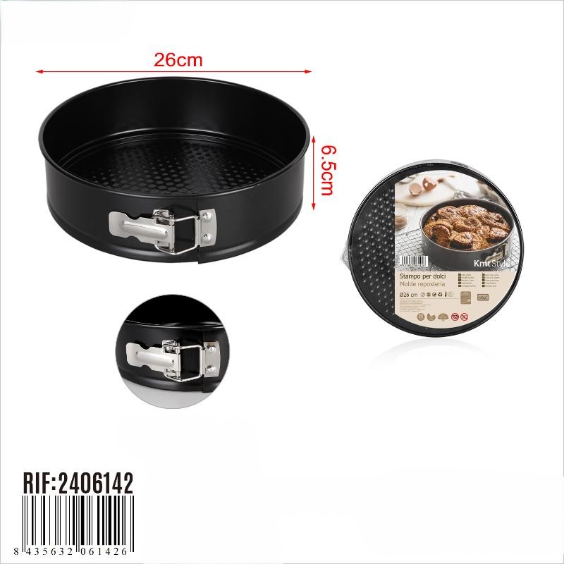 Forma redonda para bolos com 26 cm de diâmetro e 6,5 cm de altura, ideal para preparar sobremesas caseiras como cheesecakes, tortas, brownies ou bolos tradicionais. Fabricada em aço com revestimento antiaderente, permite desenformar facilmente e garante uma cozedura uniforme dos alimentos.